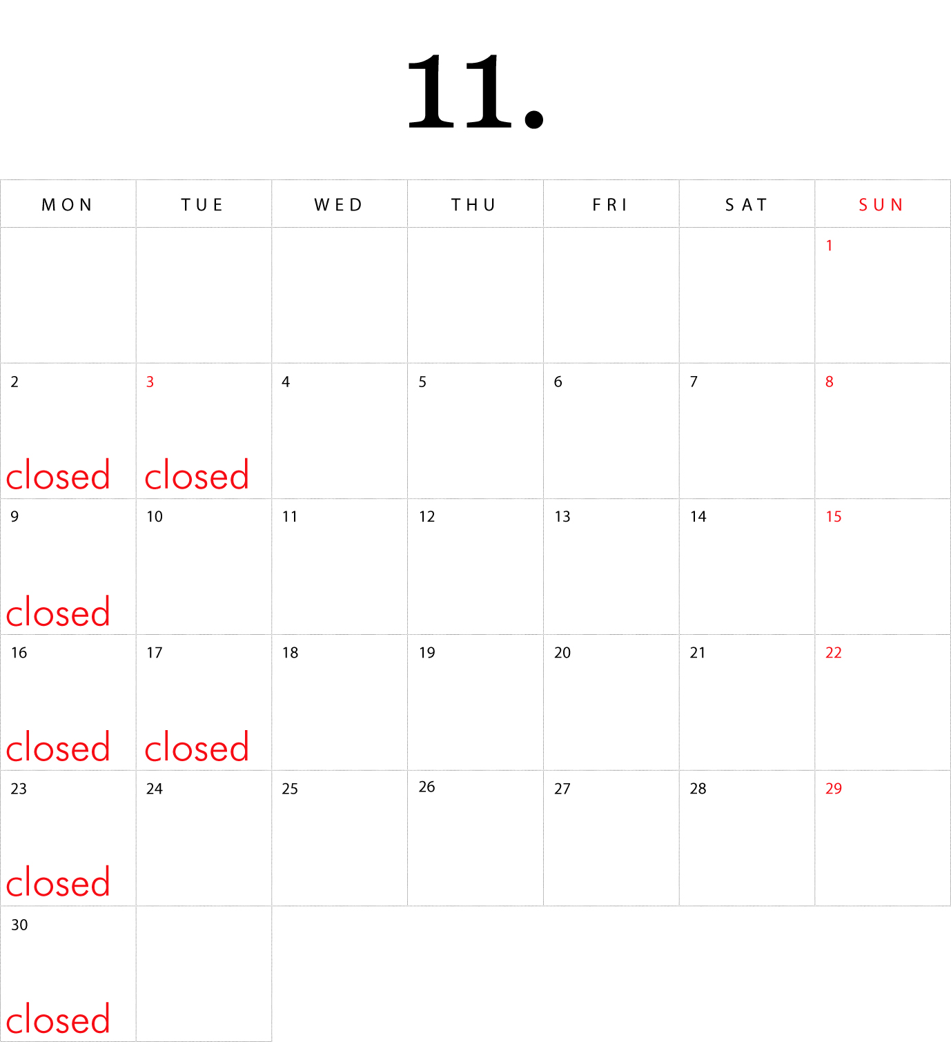 第1火曜日の3日、23日月曜日は共に祝日ですが、通常通りお休みをいただきます。